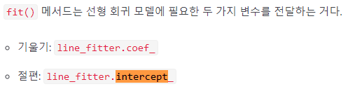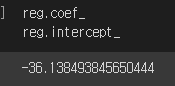 coef와 intercept를 통해서 선형 회귀의 기울기와 절편을 얻을 수 있다.