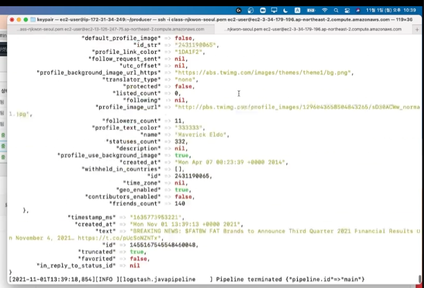 왼쪽이 producer인데, 데이터를 받아서 consumer에서 받는 것을 성공 시킨 그림이다.