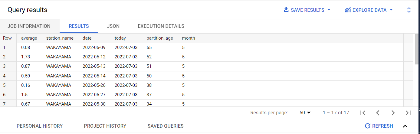 데이터 파티션 만료가 작동하는지 확인 과거 60일부터 오늘까지의 데이터만 저장하고 있는지 확인하려면 DATE_DIFF 쿼리를 실행하여 60일 후에 만료되도록 설정된 파티션의 수명을 가져옵니다. 아래는 상당한 강우량이 있는 일본 와카야마의 NOAA 기상 관측소에 대한 평균 강우량을 추적하는 쿼리입니다.