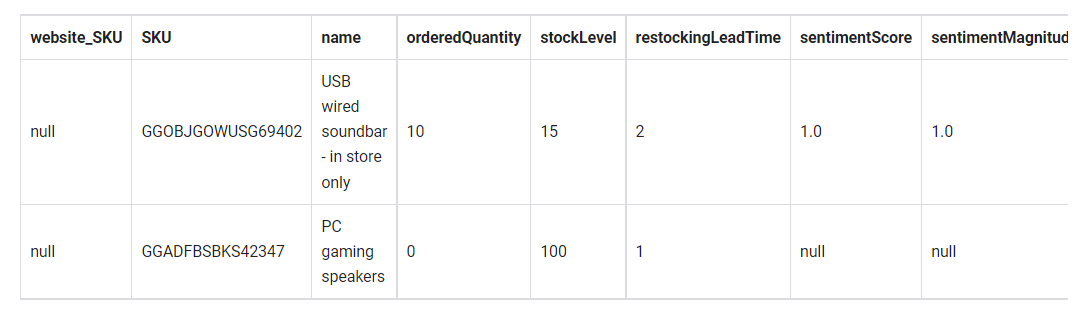 We now have two datasets: one for inventory stock level and the other for our website analytics. Let's JOIN the inventory dataset against your website product names and SKUs so you can have the inventory stock level associated with each product for sale on the website.