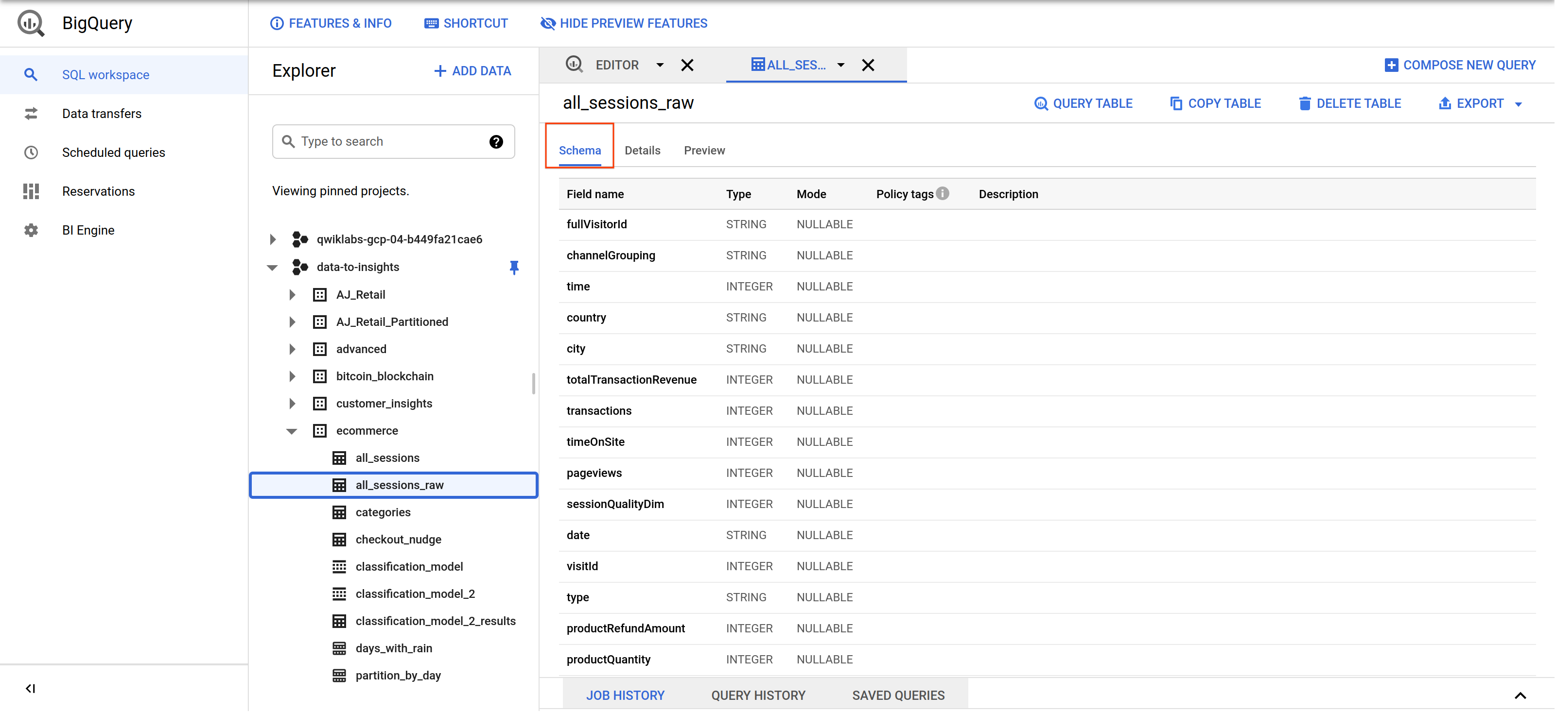 In the left pane in the Resources section, navigate to data-to-insights > ecommerce > all_sessions_raw.