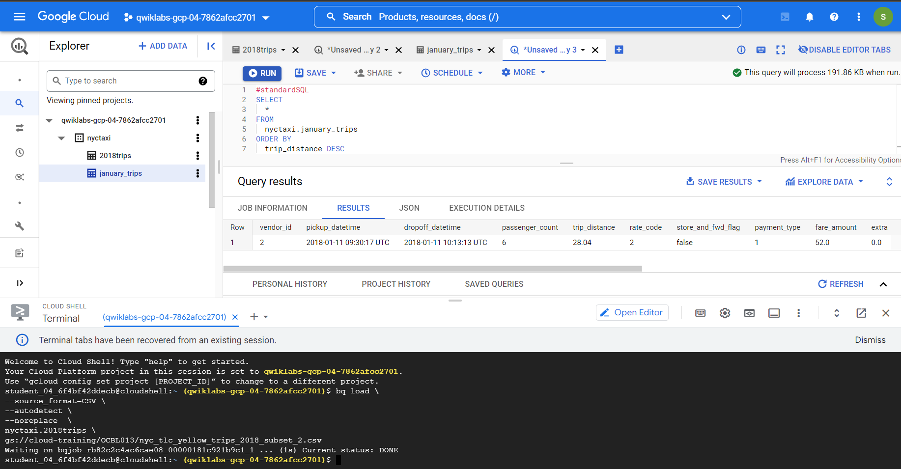 클라우드 쉘 환경에서도 빅쿼리를 접근하고, console에서도 접근 하는 것을 배웠다.