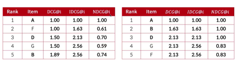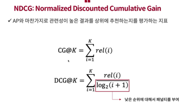 DCG 는 K 값에 따라서 많이 달라짐, 따라서 NDCG로 정규화 한다.
