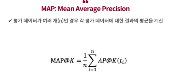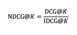 - K에 따른 변화를 최소화 하기 위해 최선의 순서일 때의 DCG@K, 즉 IDCG@K를 구하고 이를 이용하여 정규화한 지표