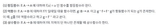 집합 A,B에 대해서 모든 집합 A의 원소에 대하여 집합 B의 원소가 하나씩 대응 할 때