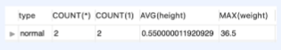 SELECT type, COUNT(*), COUNT(1), AVG(height), MAX(weight)